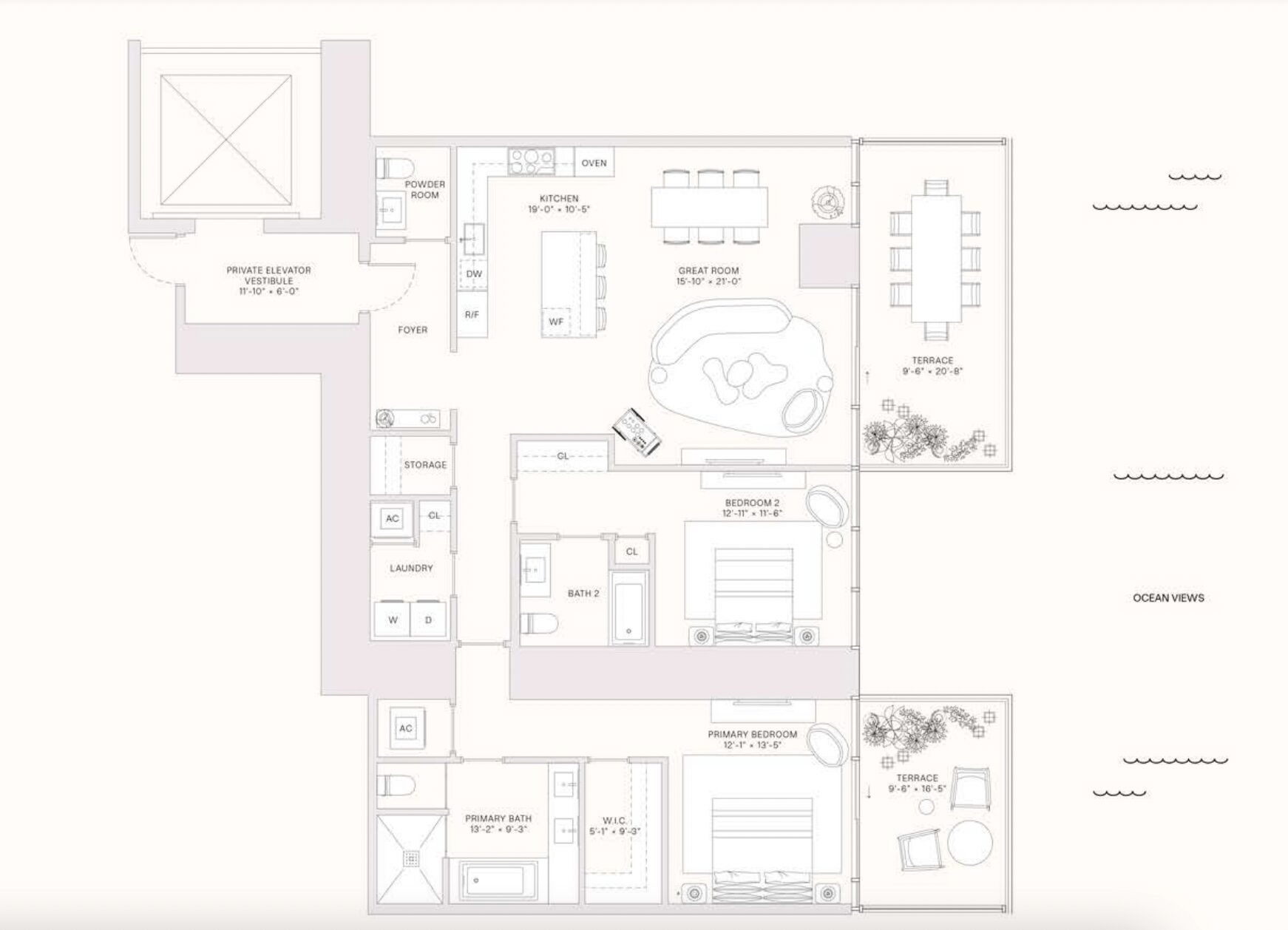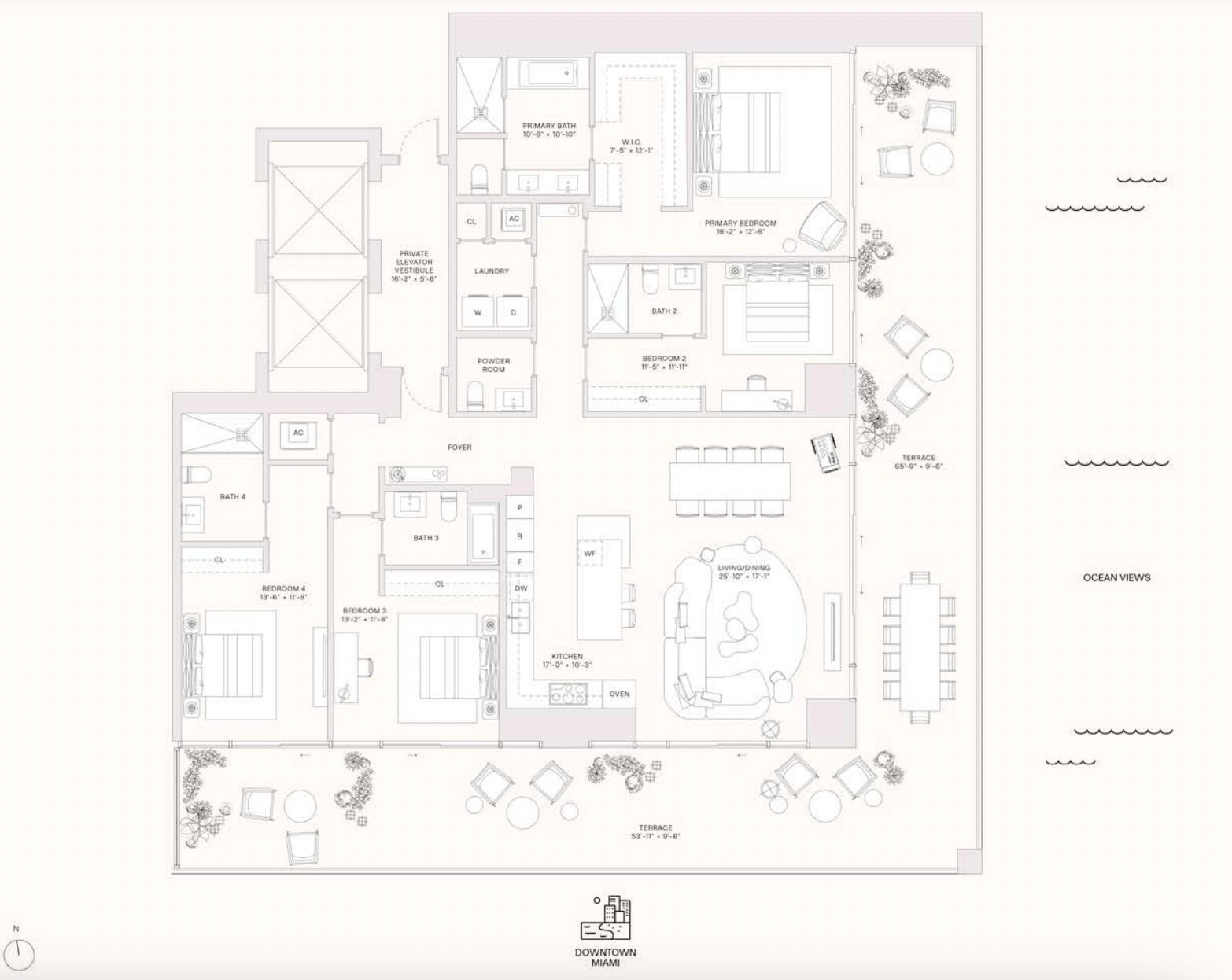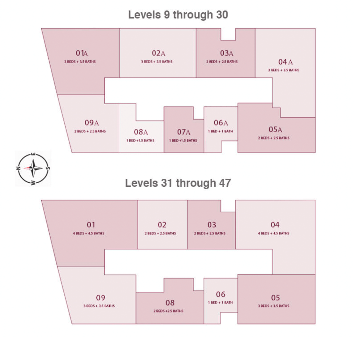 Each residence features private and semi-private elevator vestibules, expansive balconies with 180-degree views, 10’–11′ ceilings, and floor-to-ceiling glass windows. Kitchens are inspired by Jean-Georges, with Gaggenau appliances, Volcano Red Granite countertops, and Italian wood cabinetry. Bathrooms boast clay-rose ceramic tiles and brushed nickel fixtures, while provisions for motorized shades enhance convenience.
